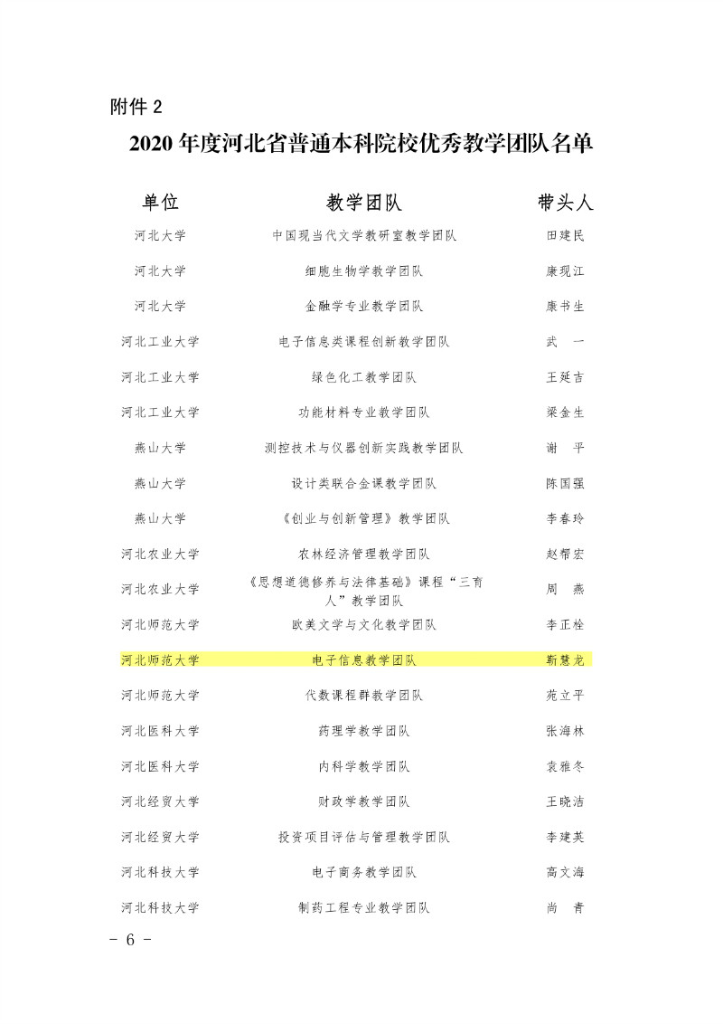 河北省教育厅关于公布2020年度河北省普通本科院校教学名师和优秀教师团队名单的通知